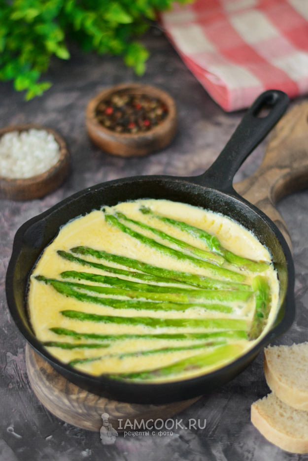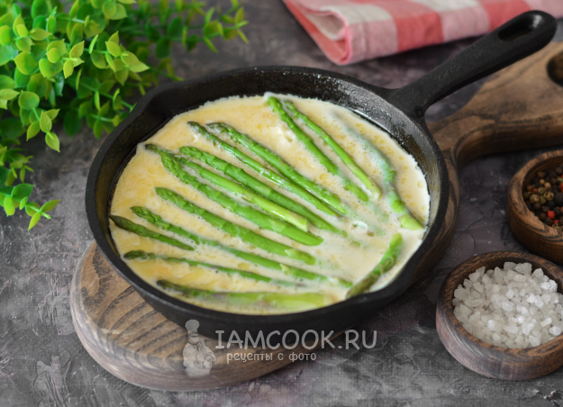 Примерно через 2-3 минуты, когда схватится низ омлета, выложите на него бланшированную спаржу (так она не провалится внутрь).