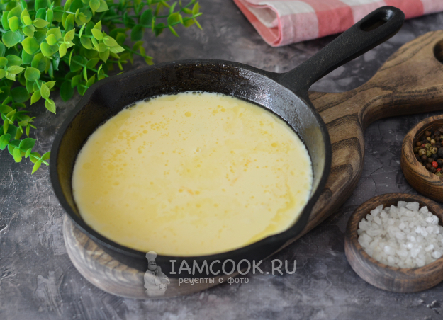 В мисочке взбейте вилкой яйца со щепоткой соли, добавьте молоко и хорошо перемешайте. Можно поперчить по вкусу.