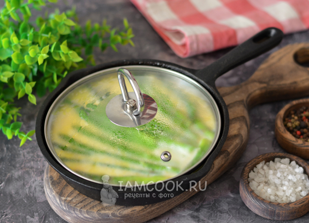 Накройте сковороду крышкой и готовьте омлет со спаржей, не тревожа его, примерно 10-15 минут. Напоминаю, что нагрев должен быть минимальным, чтобы омлет не подгорел снизу.