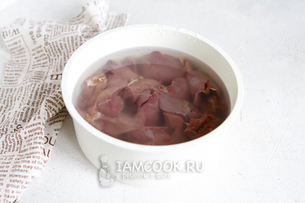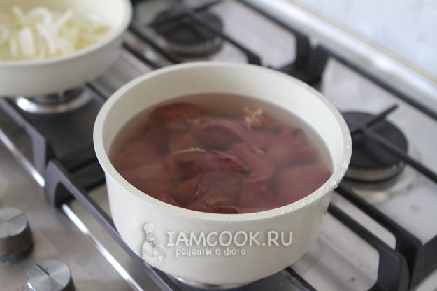 Переложить печень в глубокую кастрюлю, влить холодную воду. Вода должна полностью покрывать печень.
