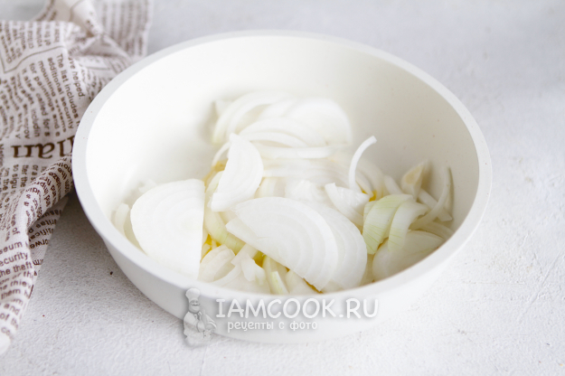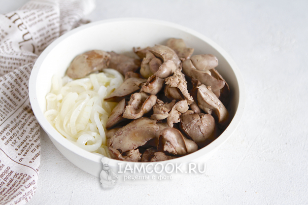 Через 7 минут печень откинуть на дуршлаг, можно еще раз промыть. Переложить печень в сковороду к луку.