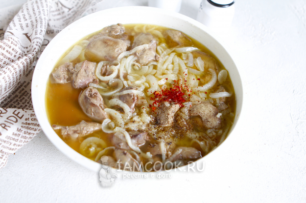 Добавить костный бульон (250-300 мл) и отправить на плиту. Тушить на небольшом огне под крышкой примерно 20-30 минут. Пусть вас не смущает такое время приготовления, печенка у меня получилась мягкой, отнюдь не резиновой, как многие утверждают.