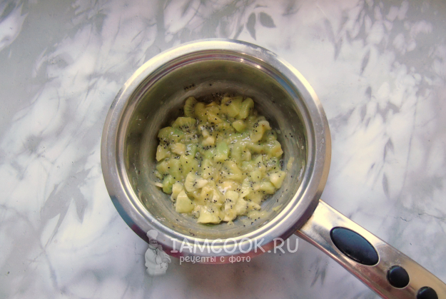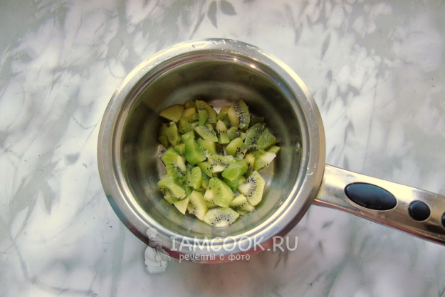 А пока тесто подходит, приготовьте начинку для пирожков. Киви помойте и очистите, нарежьте кубиками. Выложите в кастрюлю с толстым дном.