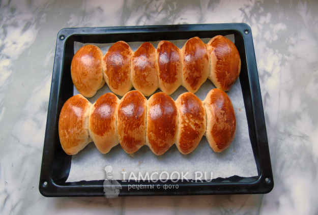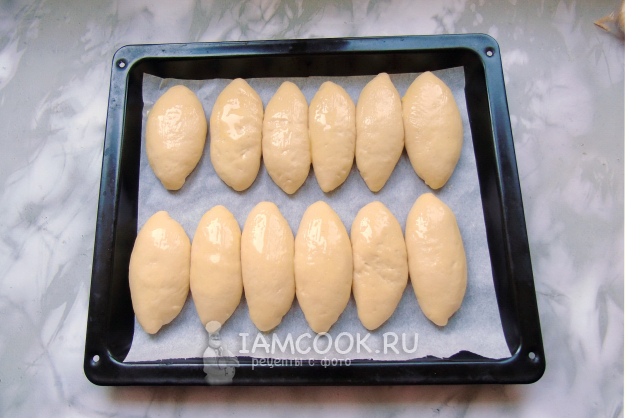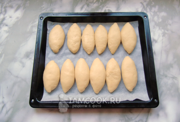 Таким образом сделайте все пирожки и выложите на противень с пекарской бумагой швом вниз.