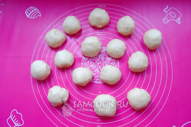 Подошедшее тесто достаньте из миски и обомните. После разделите на шарики весом приблизительно 50-60 грамм.