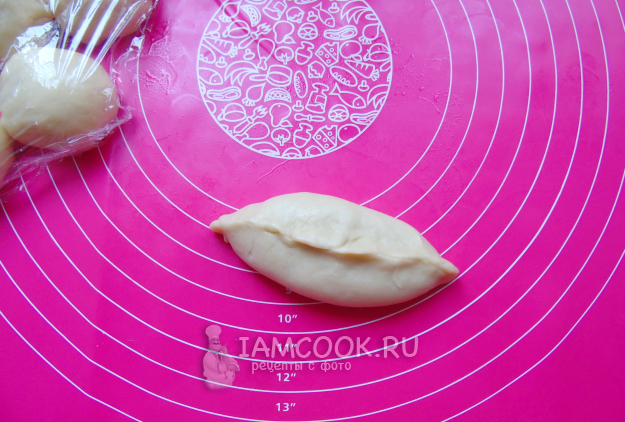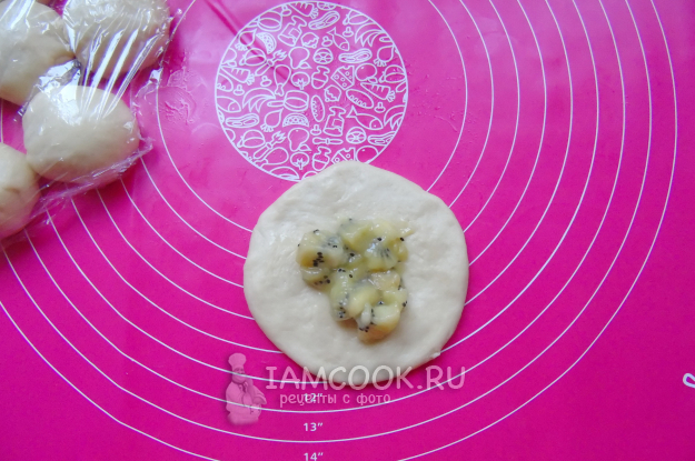 Каждый шарик теста раскатайте в лепешку, на середину которой выложите начинку.