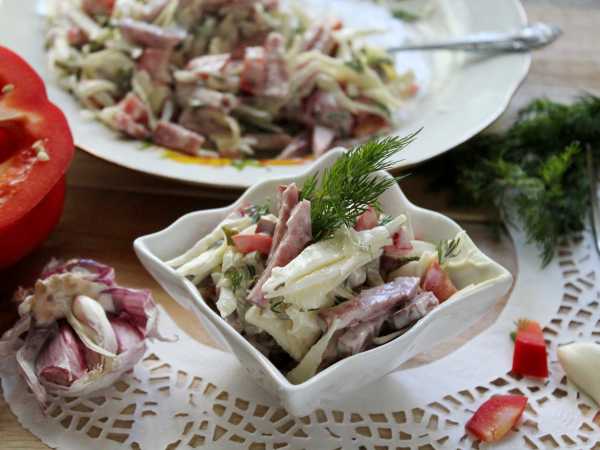 Салат с колбасой, чипсами, кукурузой и огурцом готов.