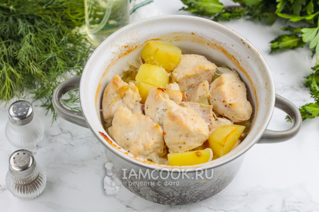 Куриное филе с картошкой в горшочках полностью готово! Выложите блюдо на тарелки и подайте к столу горячим вместе с измельченной зеленью, соусами и т.д.