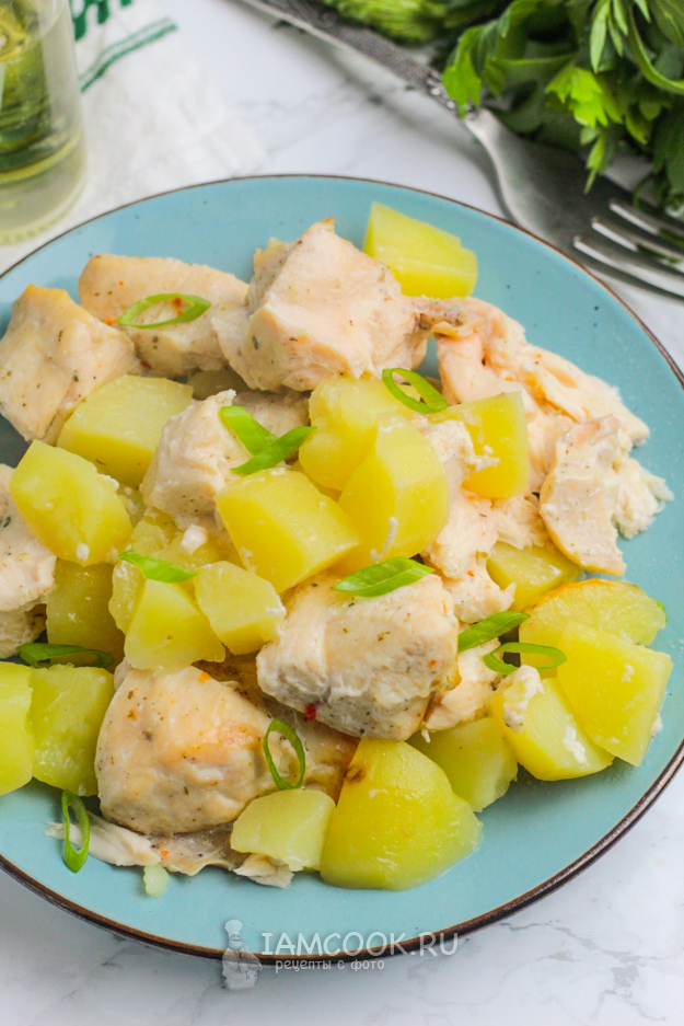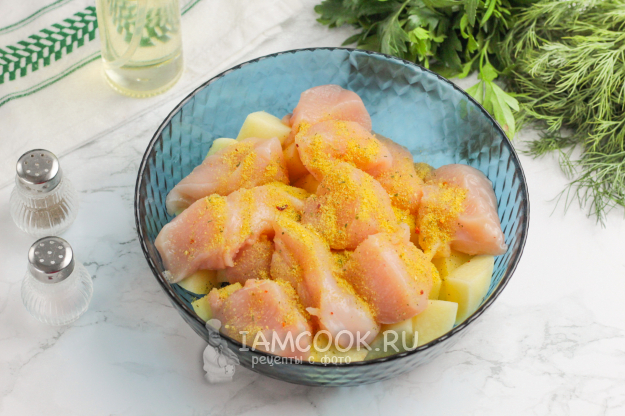 Так как грудка быстро готовится, то готовность блюда проверяйте по картофельной нарезке - она должна быть мягкой.