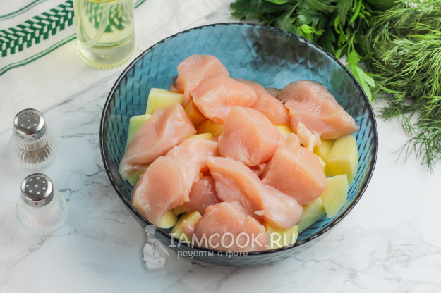 Грудку промойте в воде и обсушите бумажными салфетками. Вырежьте из нее киль, если таковой присутствует. Нарежьте порционными средними кусочками. Картофель очистите, промойте и нарежьте средними кубиками.