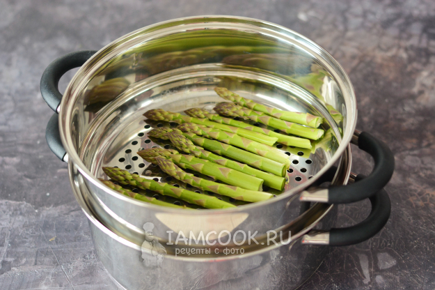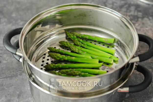 Я готовлю спаржу в кастрюле-пароварке, которая ставится на плиту.
