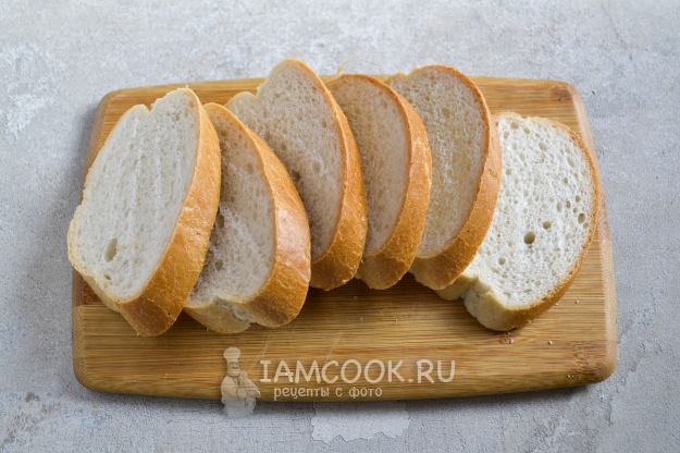 Багет нарежьте на ломтики толщиной приблизительно 1 см.