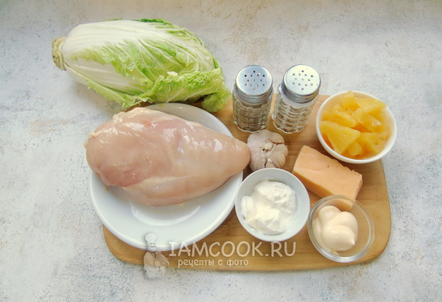 Все ингредиенты, которые нужны для приготовления салата «Сказка» с курицей и ананасами, - перед вами, на фото.