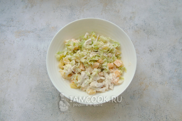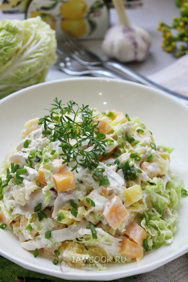 Вкусный и сытный салат «Сказка» с курицей и ананасами готов.