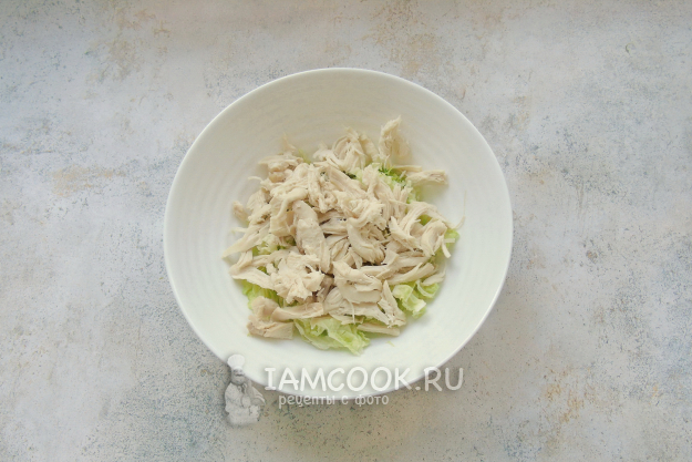 Куриное филе разберите на небольшие волокна или нарежьте. Добавьте в салат.