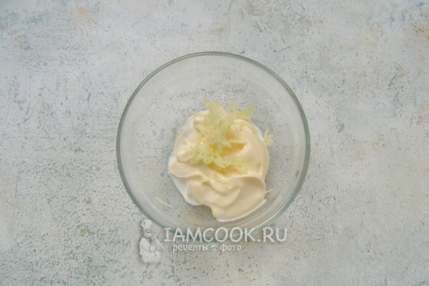Приготовьте заправку для салата. В мисочке перемешайте сметану, майонез, измельченный любым способом чеснок.