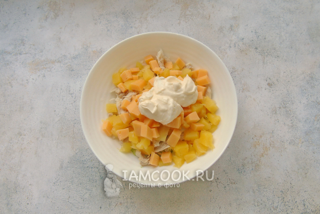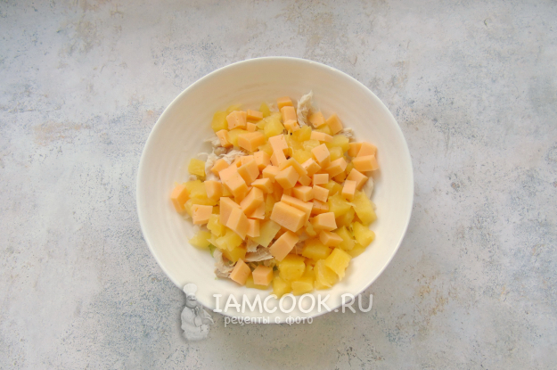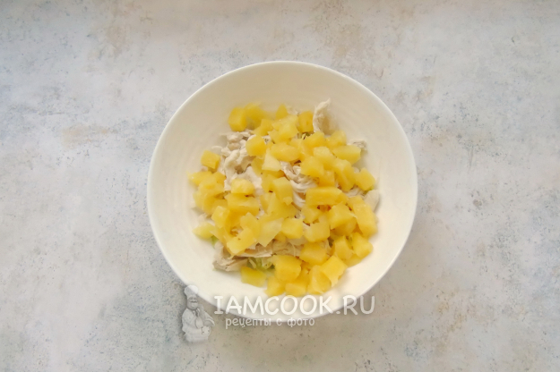 Консервированный ананас нарежьте кубиками.