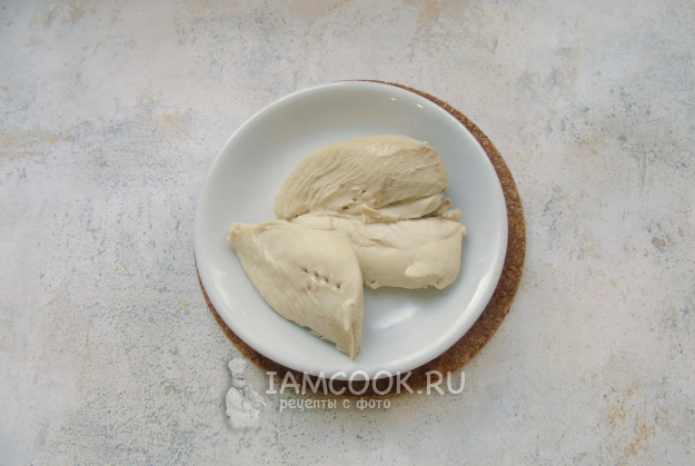 Куриное филе помойте и выложите в кастрюлю. Залейте водой и немного посолите. Доведите до кипения, огонь убавьте, снимите пену. Варите курицу 15-20 минут, до готовности. После выложите на тарелку и охладите.