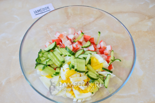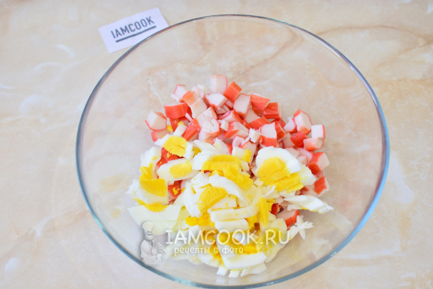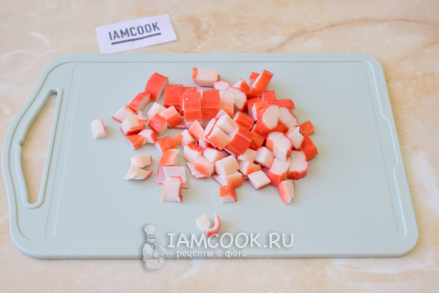 Крабовые палочки нарежьте кубиками и выложите в миску.