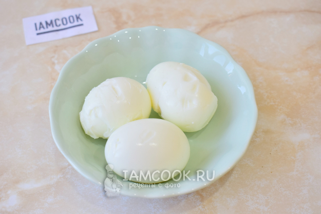 Первым делом отварите яйца в кипящей воде, примерно 7-8 минут. Затем горячую воду слейте и остудите их в холодной воде. Остывшие яйца очистите от скорлупы.