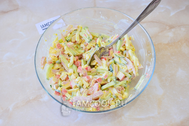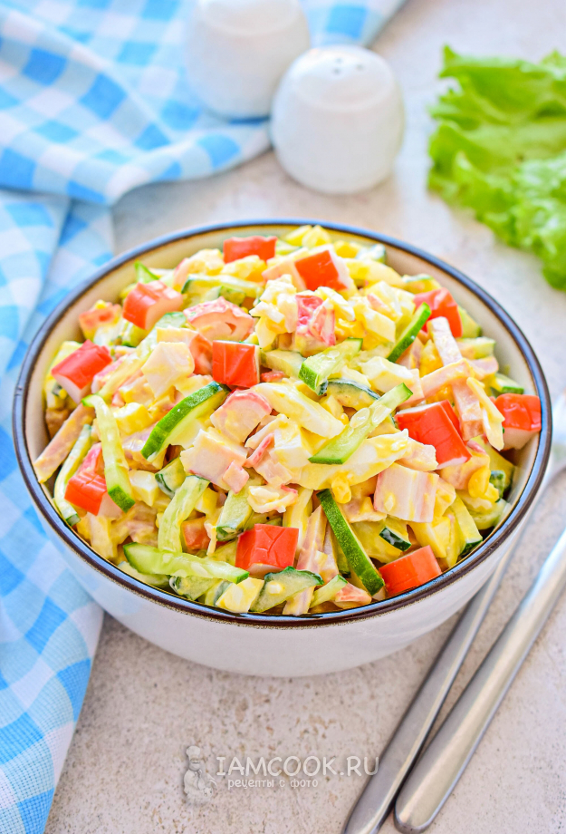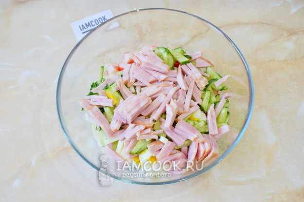 Салат «Сказка» с ветчиной и крабовыми палочками готов. Переложите его в салатник и подавайте к столу. Приятного аппетита!