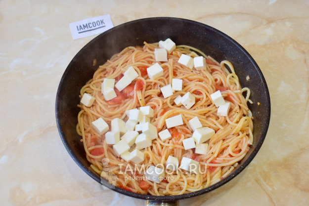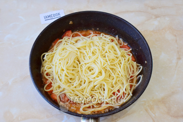 Выложите в сковороду спагетти. Перемешайте и прогрейте всё вместе.