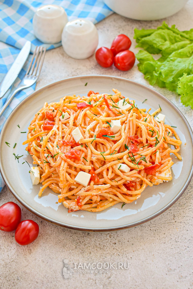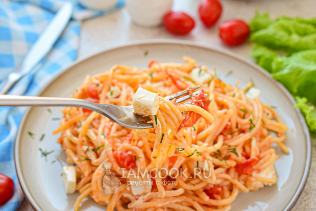 Готовые спагетти с фетаксой и помидорами разложите по тарелкам и подавайте к столу. Приятного аппетита!