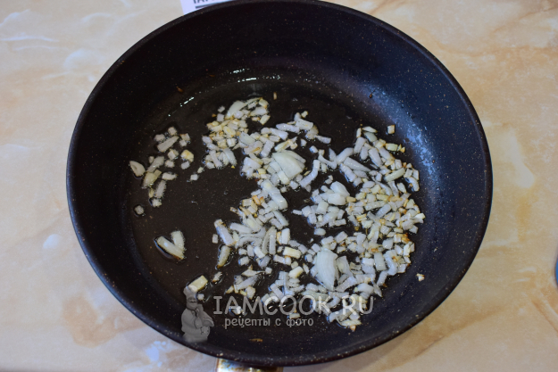 Лук очистите, ополосните в холодной воде и мелко нарежьте. Обжарьте его с добавлением растительного масла в течение минуты.