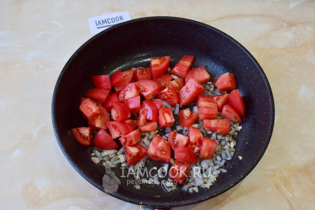 Затем добавьте в сковороду нарезанные помидоры. Потушите на небольшом огне 1-2 минуты. Помидоры станут мягче и пустят сок.