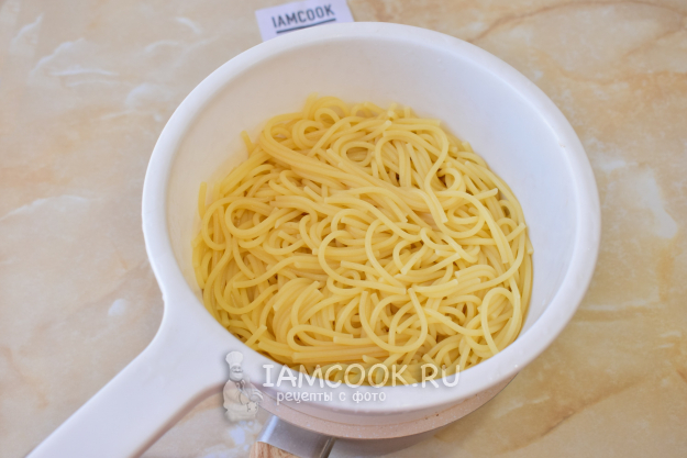 Спагетти отварите в кипящей подсоленной воде до мягкости. На это обычно уходит 10-12 минут. Готовые спагетти откиньте на дуршлаг и пролейте холодной водой.