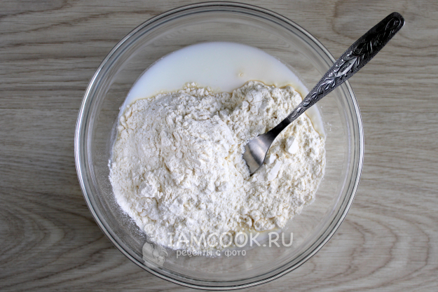 Соедините ингредиенты для теста между собой. Тут айран, соль, мука и растительное масло.