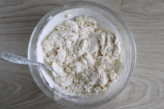 Перемешайте вилкой или лопаткой, чтобы они схватились в мягкую крошку.