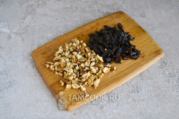 Грецкие орехи порубите ножом. Чернослив обсушите и нарежьте на мелкие кусочки.