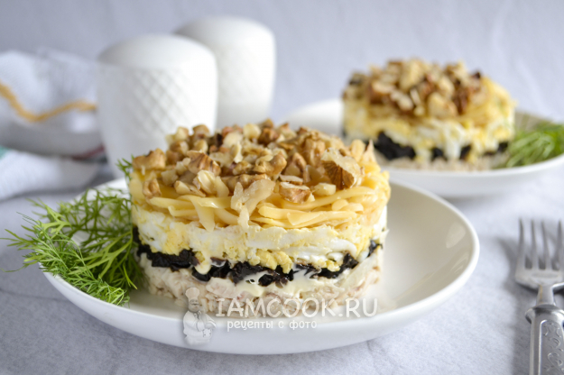 Салат «Сказка» с черносливом, курицей и грецкими орехами очень нежный, вкусный. Все продукты хорошо сочетаются по вкусу между собой.