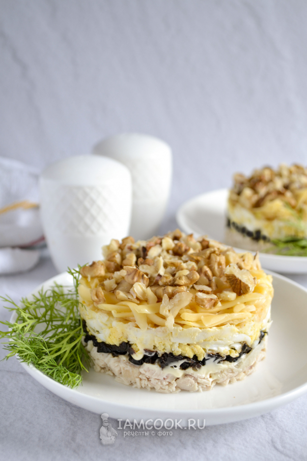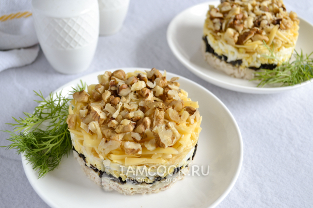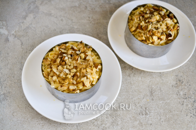 Верхний слой - из грецких орехов. Поставьте салат в холодильник на 1-2 часа, чтобы пропитался и настоялся.