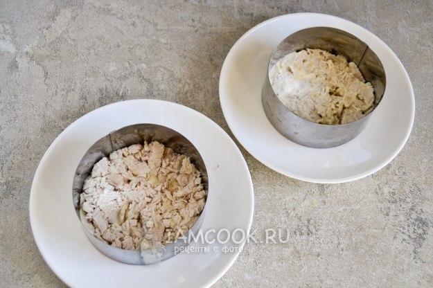Для сборки салата установите кулинарное кольцо на плоскую тарелку. Первым слоем положите куриное мясо. Уплотните мясо и смажьте майонезом. Затем укладывайте слои в следующем порядке: