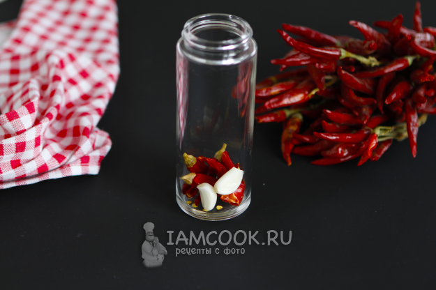 Перец чили необходимо хорошо промыть, срезать веточки и просушить. Закладывать перец в бутылку обязательно нужно сухим, иначе лишняя влага может дать абсолютно ненужный процесс брожения.