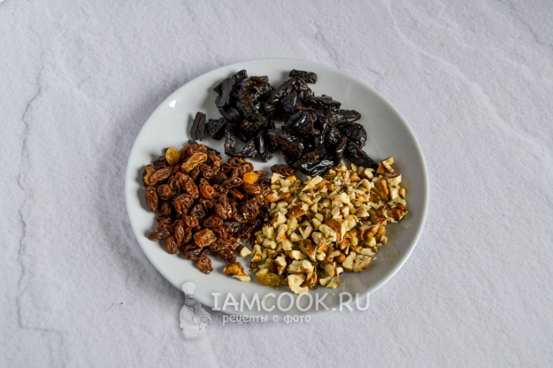 Пока идет выравнивание температуры всех продуктов, подготовьте сухофрукты. Слейте с них воду. Сухофрукты обсушите. Нарежьте чернослив соломкой. Грецкие орехи порубите ножом.
