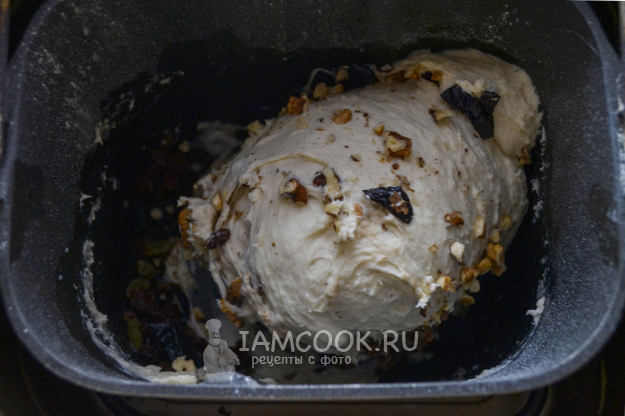 После основного замеса теста всыпьте орехи и сухофрукты в ведерко. Закройте крышку, и останется только дождаться звукового сигнала об окончании выпечки.