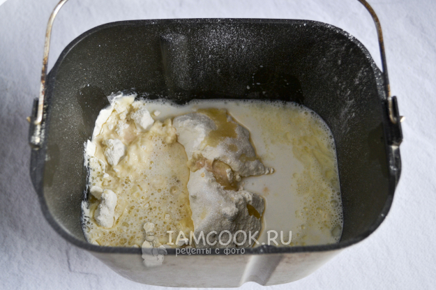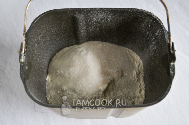 В ведерко хлебопечки просейте пшеничную муку в/с, всыпьте сахар и соль.