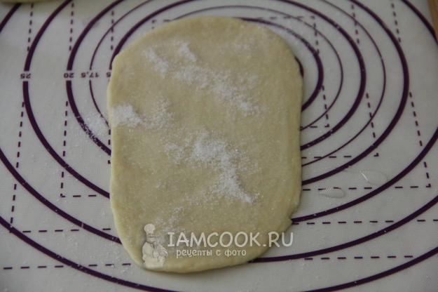 Разделить тесто на 7 равных частей. Каждую часть теста раскатать в овал. Смазать тесто маслом с помощью кисти и присыпать сахаром с ванилью. Я соединила 100 грамм сахара и 10 грамм ванильного сахара.