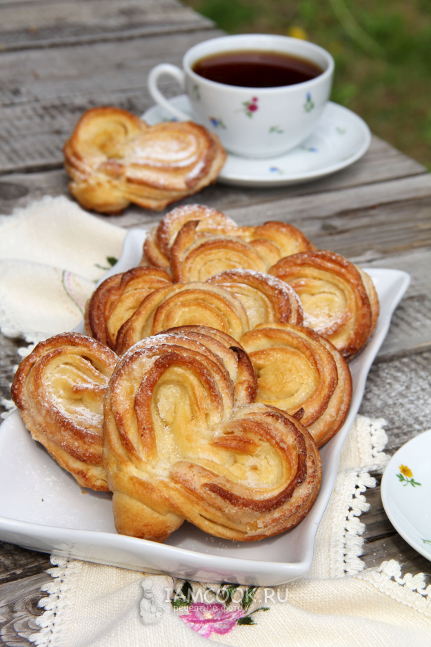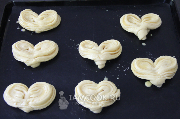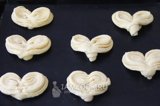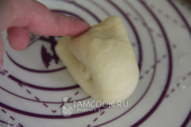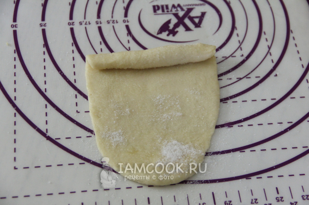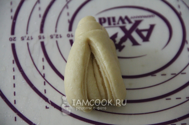 Развернуть плюшку. Выложить плюшки на противень, застеленный пергаментом или тефлоновым ковриком.