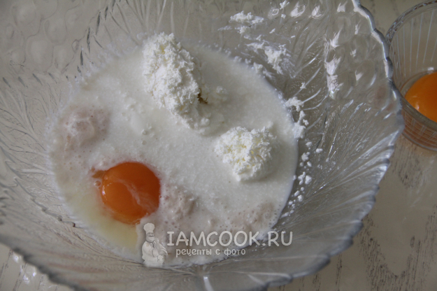 Соединить творог, 1 желток, опару и соль. Перемешать массу вилкой.
