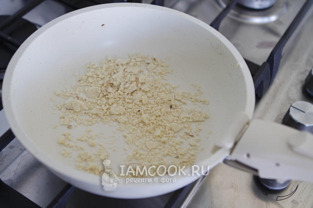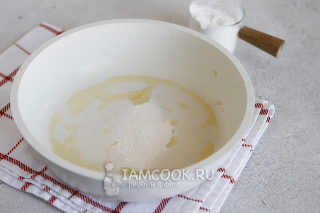 Столовую ложку муки обжарить в небольшом количестве масла до светло-желтого оттенка. Чтобы мука не пригорела, я интенсивно помешивала ее кулинарной лопаткой.
