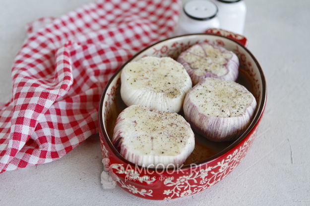 Тщательно присыпать каждую головку солью и черным перцем. Кроме соли и перца, вы можете добавить еще любимые ароматные травы, но не переборщите с ними.