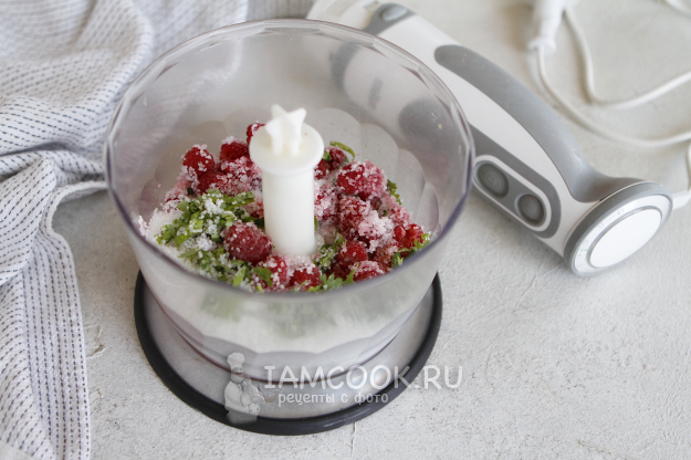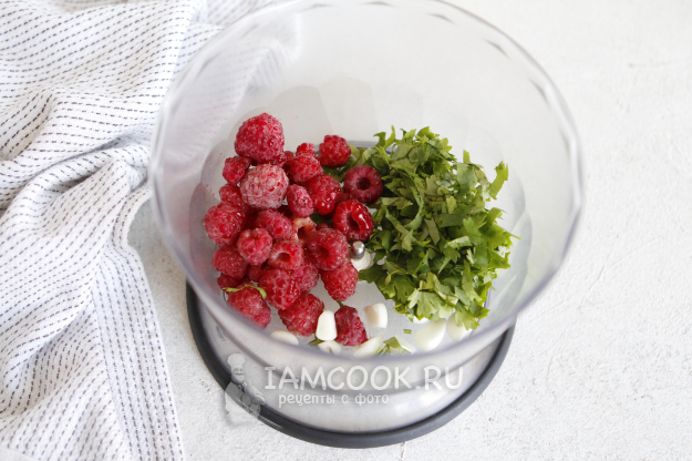 Переложите все ингредиенты в чашу блендера. Добавьте 50 г малины. На 200 г соли этого количества будет вполне достаточно. У меня была не просто сладкая, но еще и невероятно ароматная малина. Этот факт, безусловно, повлиял на конечный результат. Соль получилась очень ароматной.
