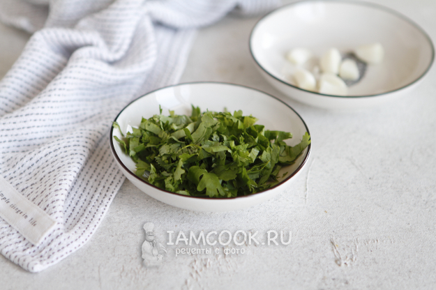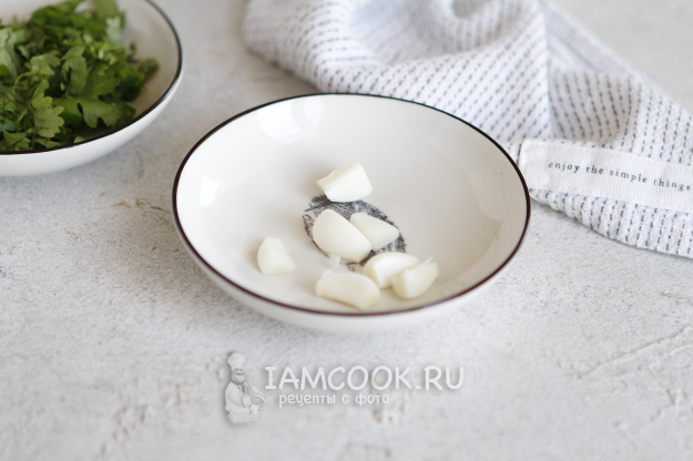 Количество ингредиентов в рецепте указано приблизительное. Если вы добавите чуть больше кинзы, будет не критично. Это относится и к чесноку. Зелень замочить в теплой воде на 5 минут, промыть, обсушить и нашинковать.