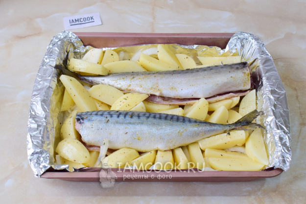 Затем выложите в форму рыбу и вокруг разложите картофель.