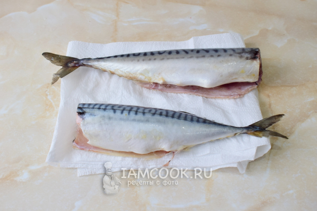 У скумбрии отрежьте головы, выпотрошите тушки. Затем промойте в проточной воде. Лишнюю влагу промокните бумажными полотенцами. Посыпьте скумбрию внутри и снаружи солью и специями.
