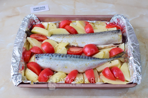 Так же разложите нарезанные помидоры. Остатками масла от картофеля смажьте рыбу и помидоры. Поставьте форму в духовку, предварительно разогретую до 180 градусов, примерно на 45-60 минут. Через 20 минут после начала запекания прикройте форму листом фольги. Плотно упаковывать не надо.